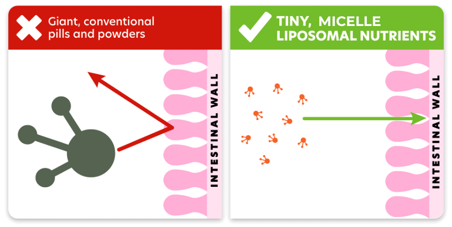 ISSUE #2: They are made of giant nutrients – meaning they are encapsulated in such a form that is too big to squeeze past your small intestine wall, hindering absorption.